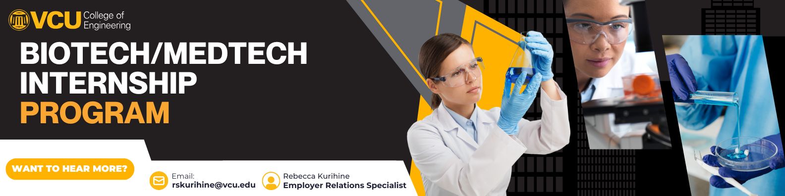The VCU College of Engineering is partnering with Virginia-based employers to provide high-impact internship opportunities in the engineering fields of Biotech, Medtech, and Pharmaceuticals. By combining university and state funding, eligible employers can hire a VCU student at no net cost for wages.